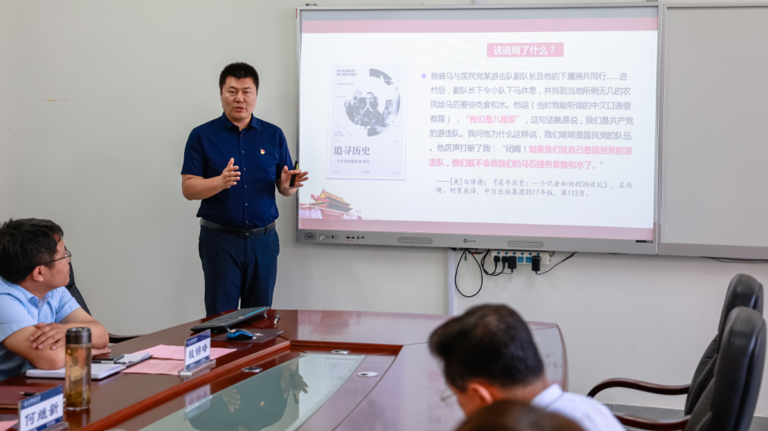 中国近现代史纲要教研室杨贺副教授以《为什么说中国共产党是中华民族抗日战争的中流砥柱》为题开展了集体备课,他围绕砥柱山巍、稳、硬的特征,从“顶天立地、指引方向”“风吹雨打、岿然不动”“千磨万折、百炼成钢”三个方面深刻阐述了为什么说中国共产党是中华民族抗日战争的中流砥柱,充分展示了我校思政课教师坚持“八个相统一”原则,精心打磨课程的成果。