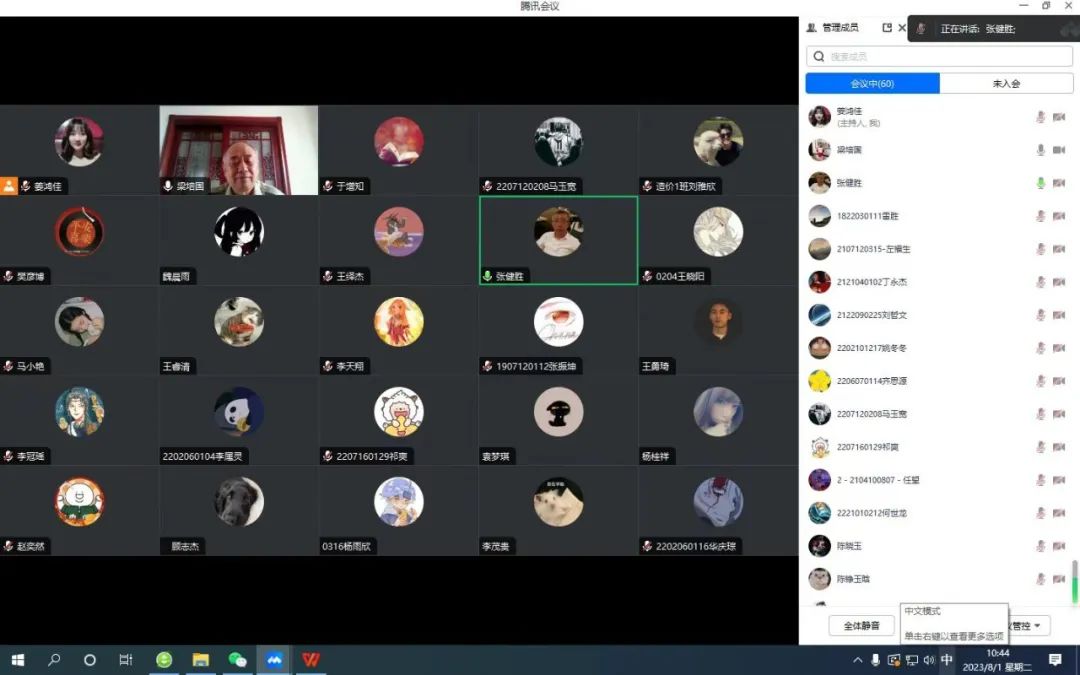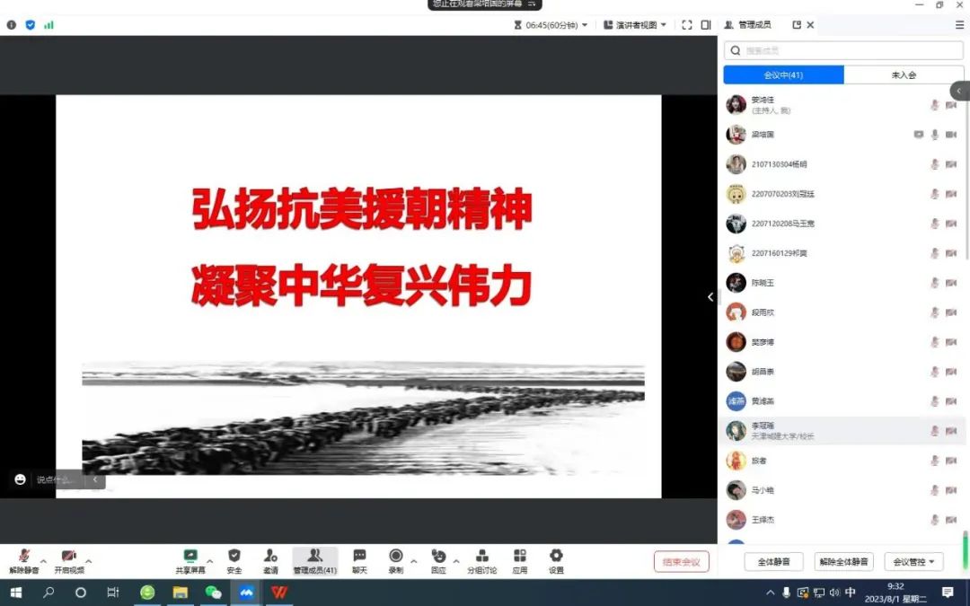 8月1日,校关工委联合党委学工部以线上方式召开“八一”建军节老少主题座谈会。天津市军休系统关工委主任、市老战士宣讲团团员、原军事交通学院指挥系政委梁培国大校出席会议。我校离退休工作处处长、关心下一代工作委员会秘书长张健胜,学工部相关工作负责同志,以及大学生预备连国防后卫班、国旗班和预储班共计60人参会。
