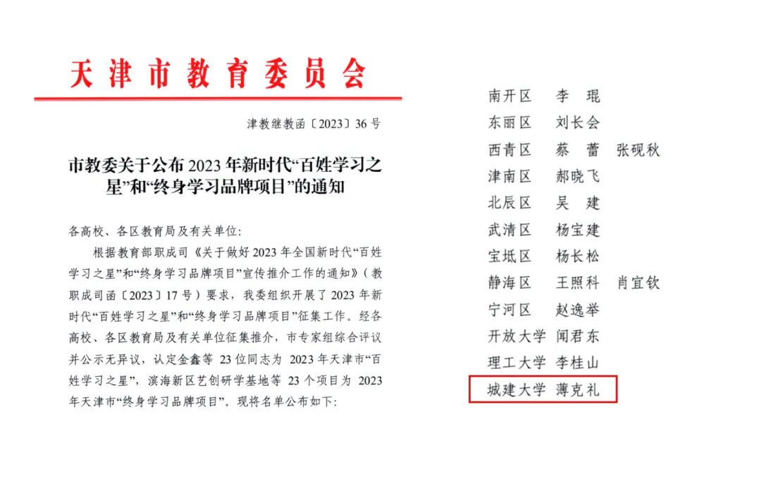 近日,天津市教育委员会公布2023年新时代“百姓学习之星”和“终身学习品牌项目”评选结果,我校马克思主义学院教师薄克礼荣获2023年新时代“百姓学习之星”荣誉称号。