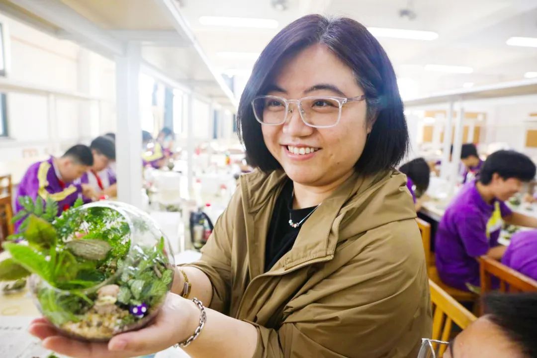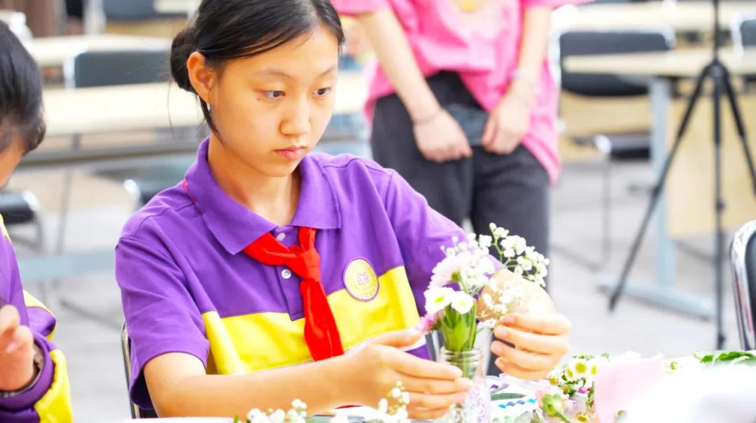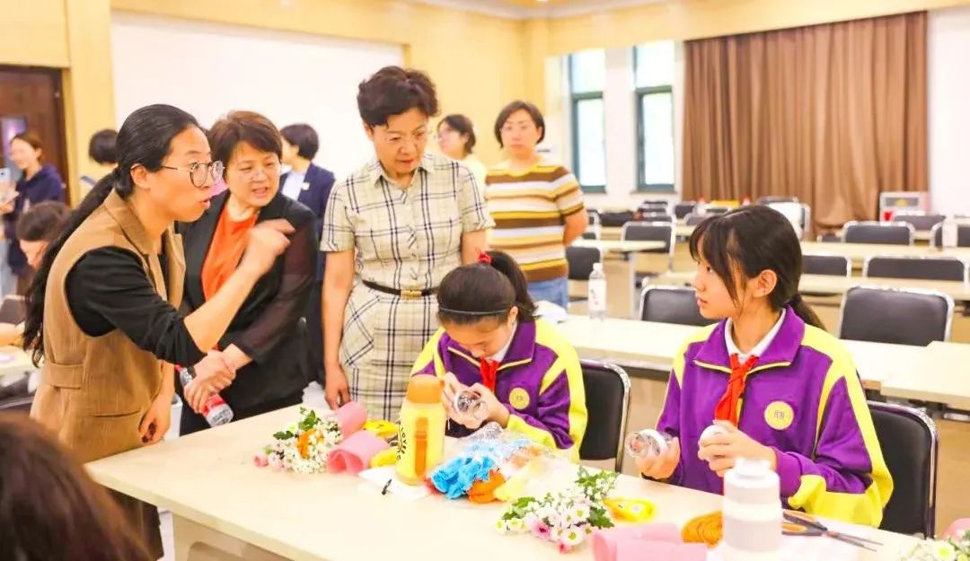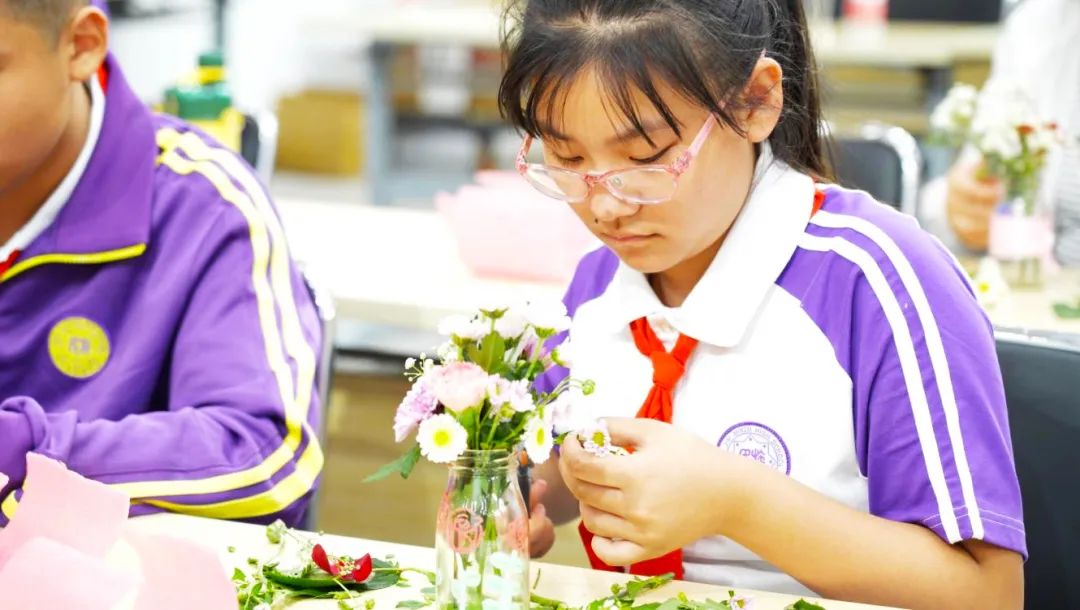 “老师,我在废弃的奶瓶上画上了紫色的花纹,我喜欢紫色的花朵,搭配一下可以吗?”“可以的,你还可以选择紫色的缎带进行装饰,再选择一些素色的花朵进行搭配,这样主花宾花有所区分更漂亮。”在“迷人的垃圾——变废为宝插花课”上,天津城建大学建筑学院的许老师亲切地回答着每一位中学生所提出的每一个问题。