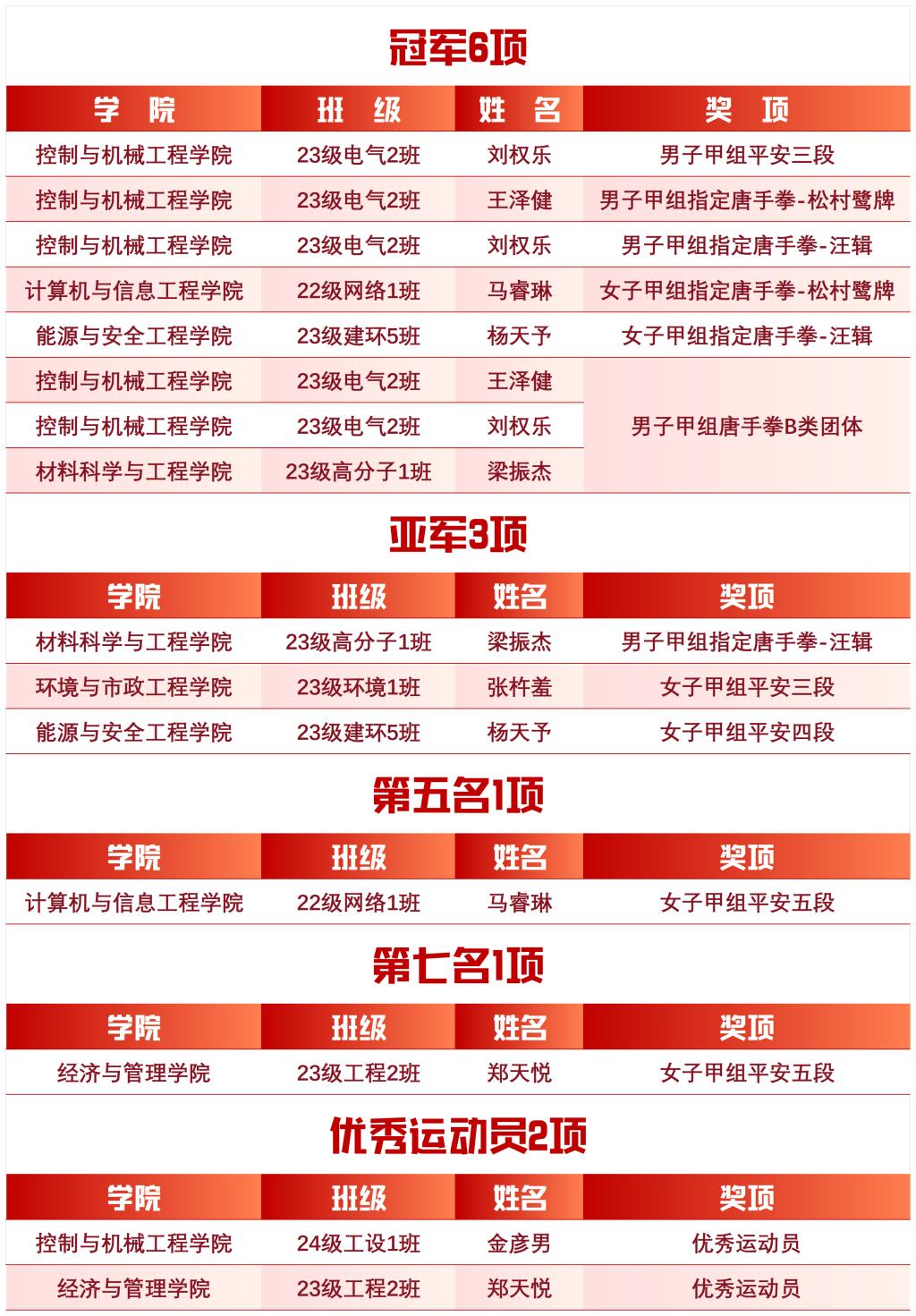 本次比赛,我校共选派8名运动员参赛,在体育部刘丽老师和李正老师的悉心指导下,同学们不仅在招式技法上得到精进,更在尚武精神、坚韧品格的塑造上实现了提升。赛场上,他们完美诠释了“重德重能 善学善建”的校训精神,彰显了我校推进新时代民族传统体育教育、深化体教融合的重要成果,展现了天津城建大学学子刚健有为、昂扬向上的青春风采。