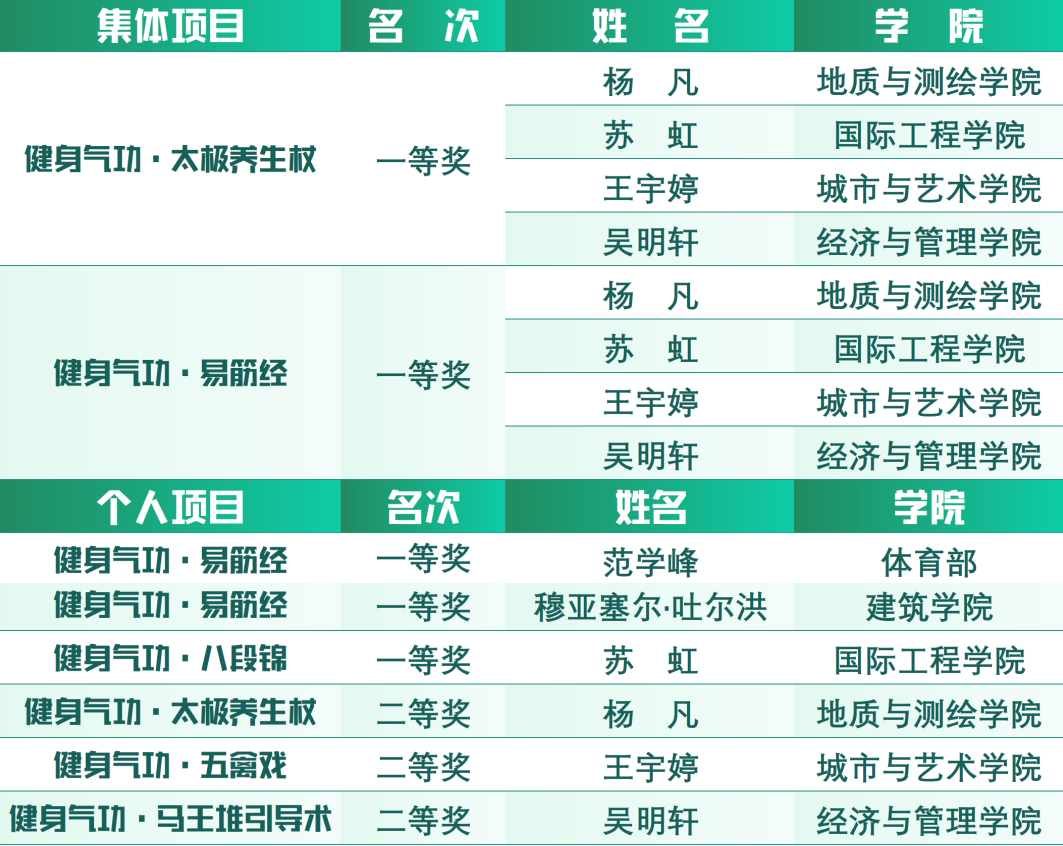 我校参赛队伍由体育部主任王建华带队,教师范学峰担任教练,队员包括建筑学院穆亚塞尔·吐尔洪、国际工程学院苏虹、地质与测绘学院杨凡、城市与艺术学院王宇婷以及经济与管理学院吴明轩。