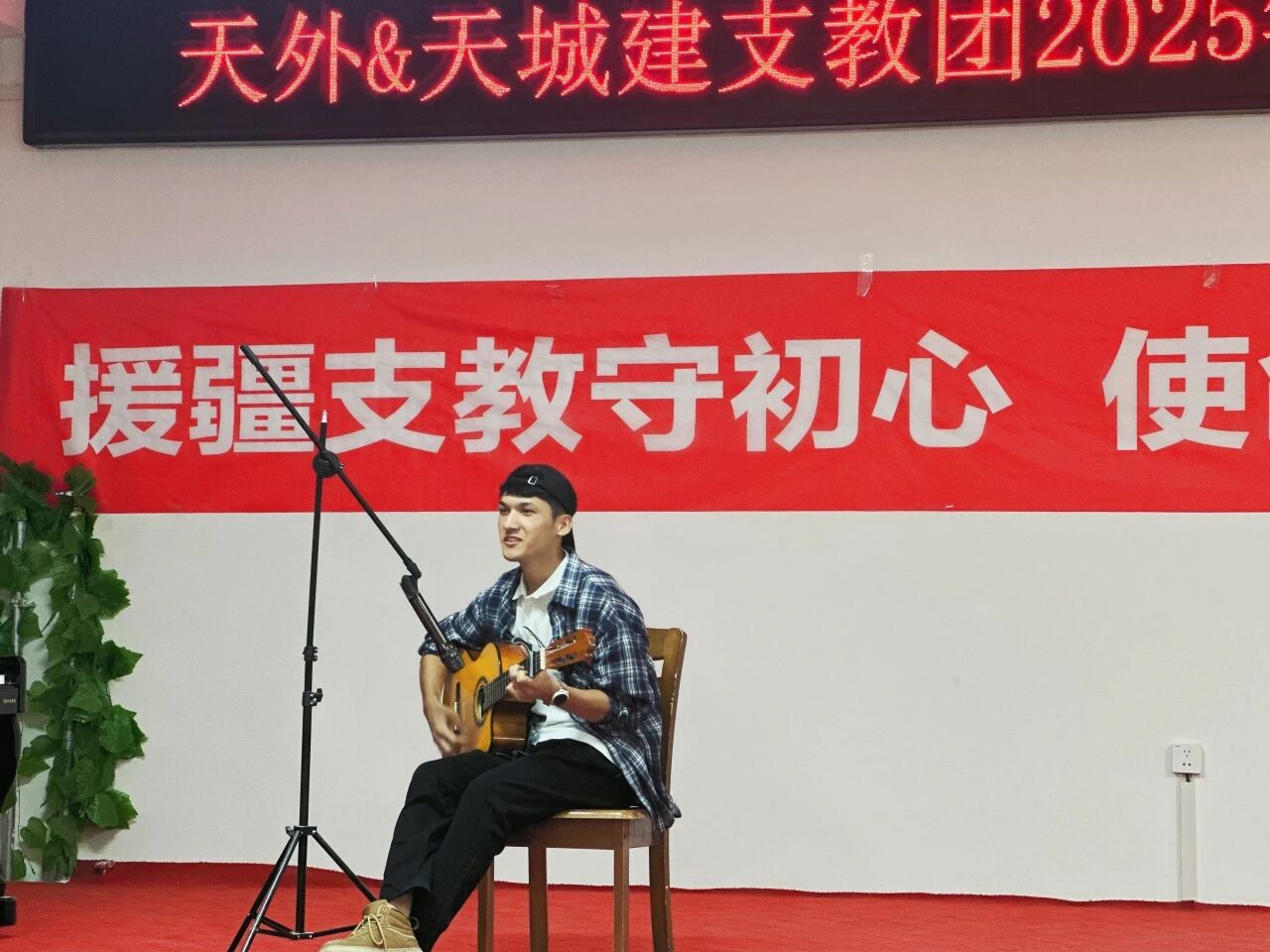 晚会在歌曲《我乘着风飞过来》中拉开序幕。舞台上,同学们以精心编排的歌曲、舞蹈、诗朗诵、乐器演奏等节目,编织出一幅多姿多彩的文化画卷。钢琴独奏《至少还有你》的婉转旋律与新疆舞蹈《打起手鼓唱起歌》的欢快节奏相映成趣,恰如东西方文化在丝路古道上相遇相融的和美乐章。我们特别编排了情景剧《陈母问勇》,当那句“清澈的爱,只为中国”从两名退役大学生士兵口中铿锵念出,台下不少观众湿润了眼眶,掌声如潮水般涌动。最动人的时刻莫过于两校师生齐声合唱《相亲相爱》,在明澈月光与点点星光交织的夜空下,我们共同许下“建设美丽新疆”的青春誓言,歌声穿透戈壁的夜风,飘向遥远的天际。