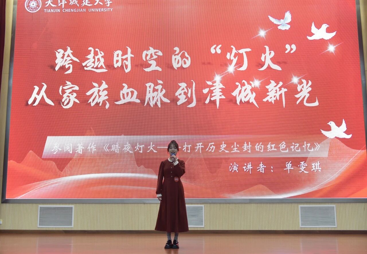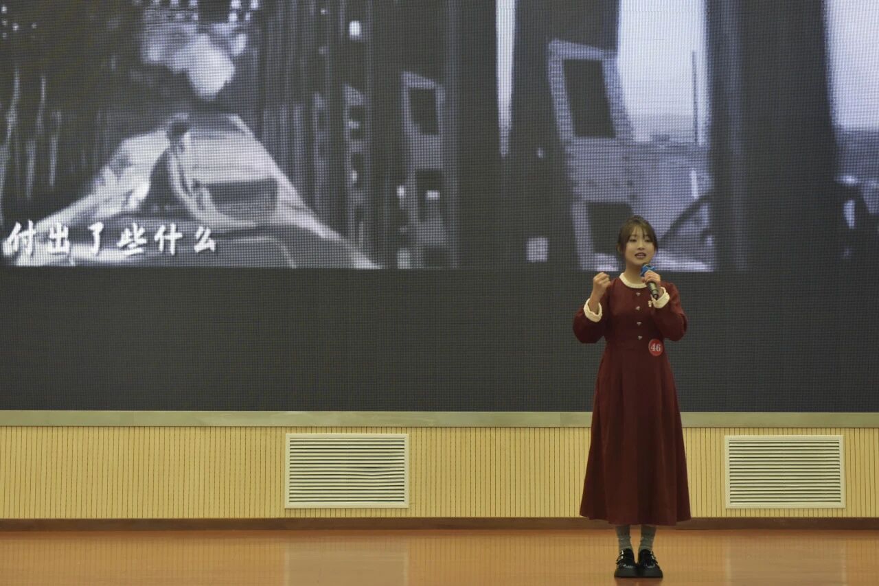 单雯琪同学以《跨越时空的“灯火”,从家族血脉到津城新光》为演讲主题,参阅著作《暗夜灯火——打开历史尘封的红色记忆》。她结合真实经历和切身感受,以极富感染力的演讲抒发对信念的坚守、对家国的热忱,把青春融入祖国的山河,用行动礼赞不朽的丰碑,深深打动着在场的评委与观众,展现出我校学子昂扬向上的精神面貌和拼搏精神。