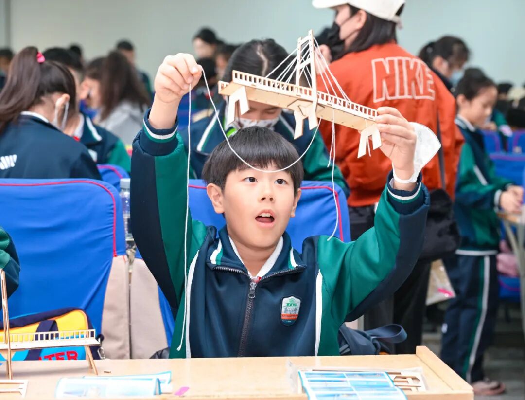 报告结束后,桥梁设计师实践环节正式启动。孩子们分组围坐,手持斜拉桥模型构件,从解读图纸到拼接零件,时而为如何固定桥塔争论,时而为成功安装绳索击掌。短短40分钟,一座座迷你斜拉桥在课桌上“挺立”。孩子们捧着自己的作品,脸上满是成就感:“我要给家乡建一座最安全的桥!”稚嫩的话语里,藏着对未来的憧憬,更藏着建设祖国的初心。