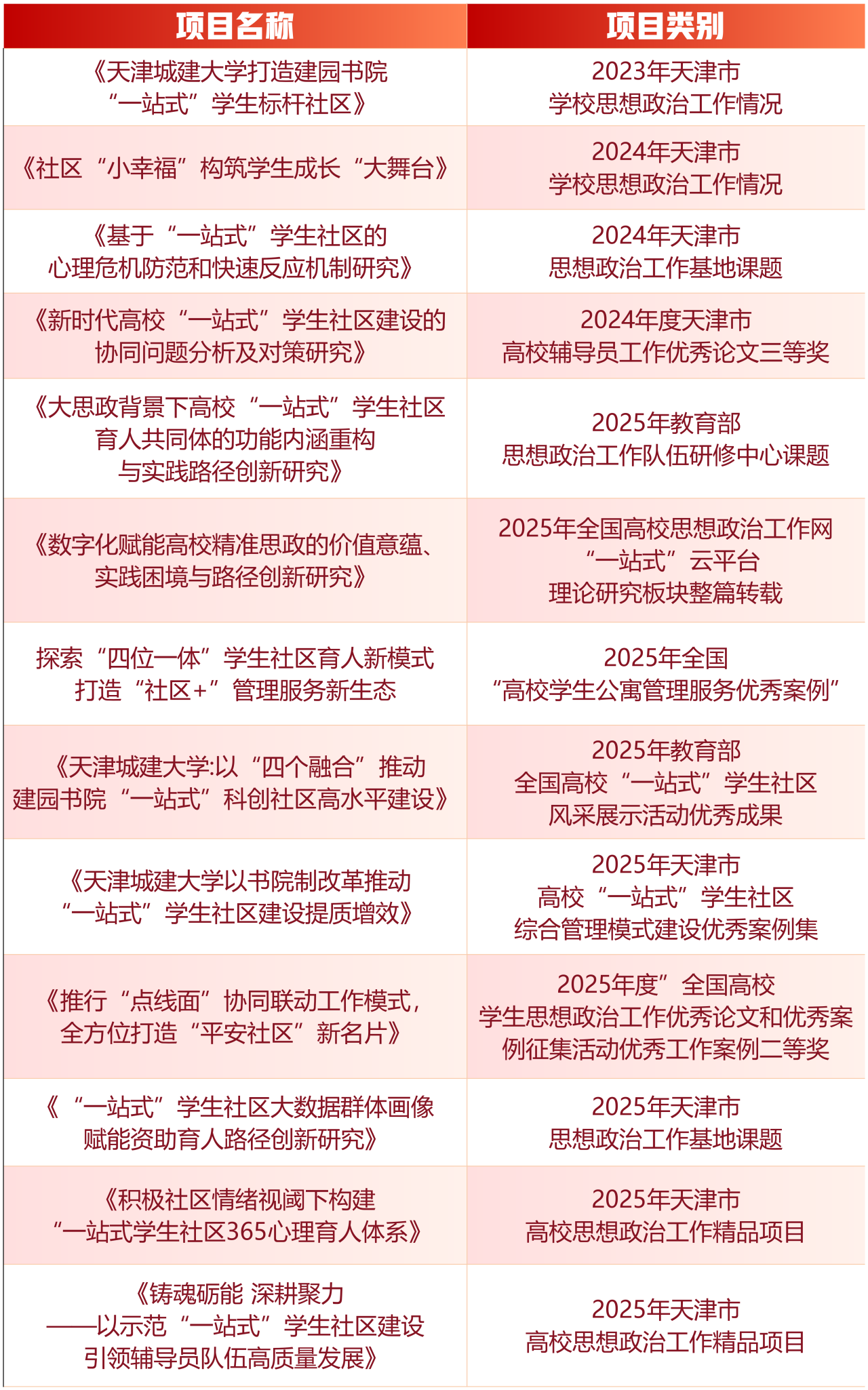 学校在扎实推进“一站式”学生社区建设的过程中,始终坚持理论研究与实践探索相结合,在夯实建设基础的同时,不断深化内涵建设,取得了系列丰硕成果。近两年,学校围绕“一站式”学生社区建设申报天津市思想政治工作基地课题2项、教育部思想政治工作队伍研修中心课题1项,立项天津市高校思想政治工作精品项目2项,发表高水平论文2篇,其中1篇荣获2024年度天津市高校辅导员工作优秀论文三等奖、1篇被全国高校思想政治工作网“一站式”云平台理论研究板块整篇转载,涵盖社区党建、文化育人、数字赋能等多个方向,体现了学校在理论探索方面的扎实功底。在实践层面,1篇工作案例获评全国“高校学生公寓管理服务优秀案例”,1篇入选教育部2025年全国高校“一站式”学生社区风采展示活动优秀成果,1篇入选天津市高校“一站式”学生社区综合管理模式建设优秀案例集,1篇在2025年度”全国高校学生思想政治工作优秀论文和优秀案例征集活动”中获评优秀工作案例二等奖。
