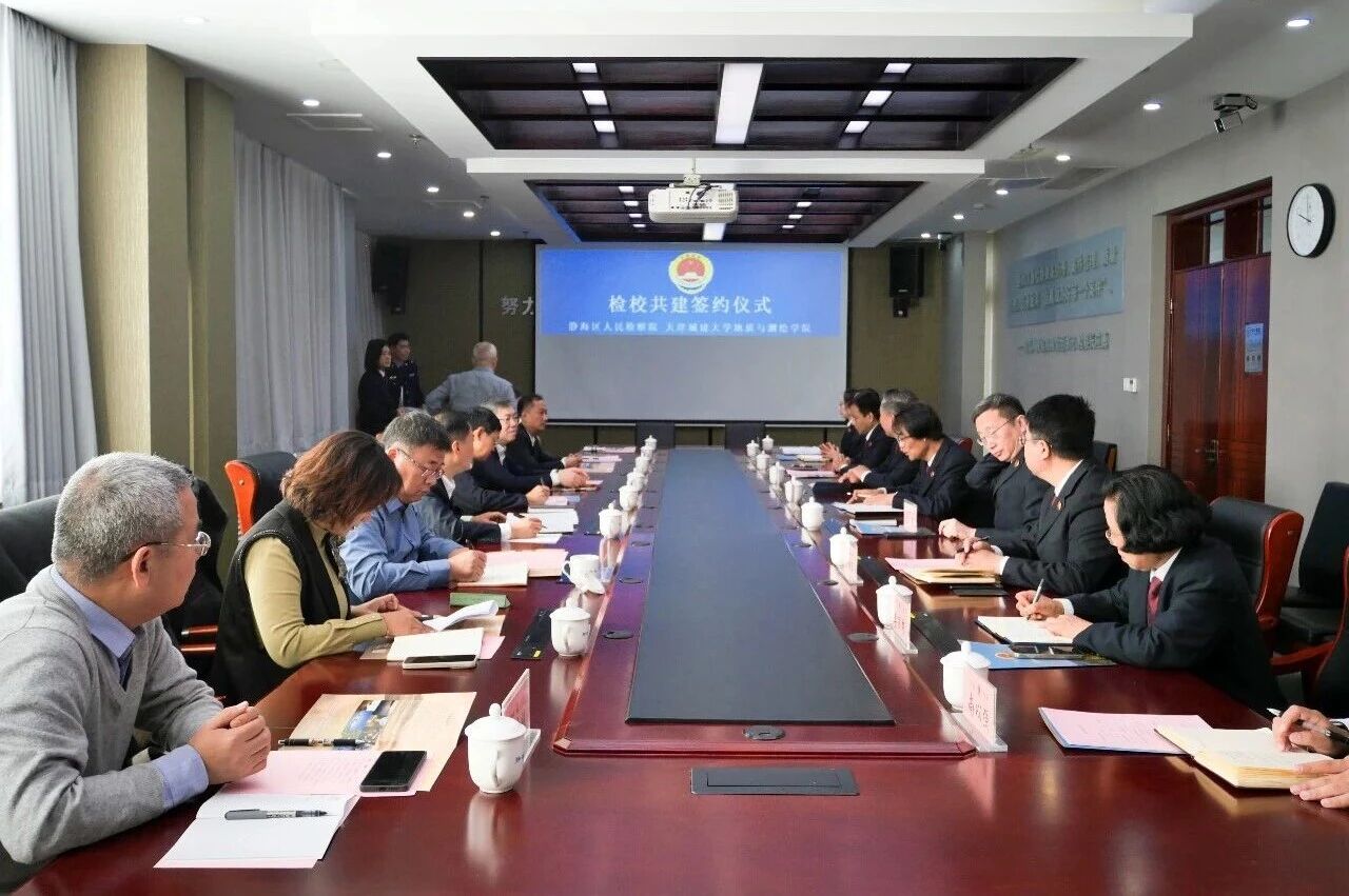 近日,我校地质与测绘学院与静海区人民检察院签署合作协议,并共同为“卫星遥感辅助检察办案联合实验室”揭牌,签约仪式在静海区人民检察院举行。市检察院党组成员、政治部主任王德群、九三学社天津市委员会秘书长严海、静海区委常委、统战部部长、区政协党组副书记刘启建等嘉宾出席。静海区检察院党组书记、代理检察长孙先锋主持签约仪式。