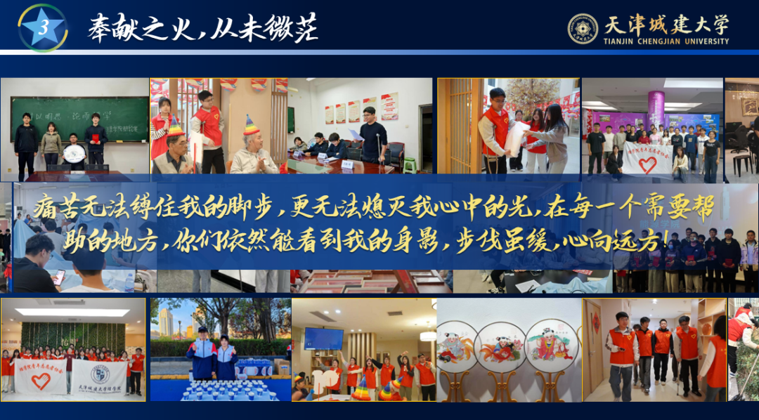 “自己淋过雨,总想为别人撑把伞。”在学校,他是班长,是青协部长;在校外,他积极投身于各类志愿服务活动中,为像他一样的残疾儿童送去爱心,为养老院的老人送去关爱,累计志愿服务时长超过1000小时,生动展现了学生党员的奉献与担当。步伐虽缓,心向远方;奉献之火,从未微茫。