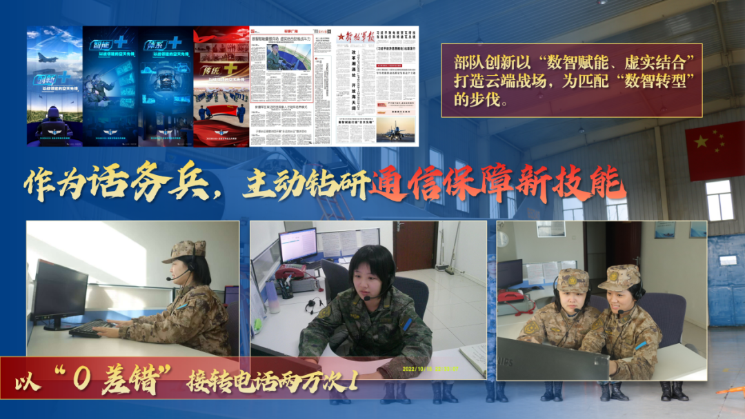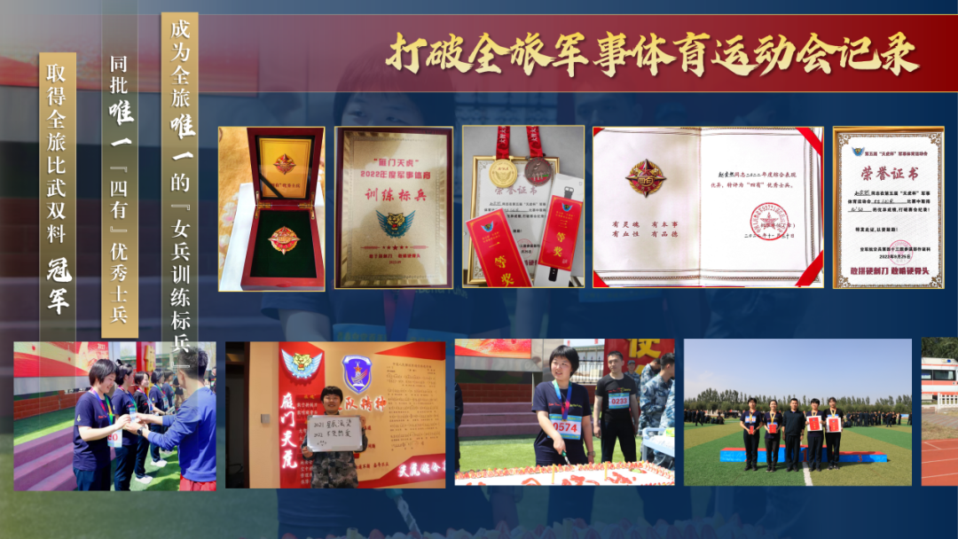 “不爱红装爱武装”是她从未改变的儿时志向。她以严苛标准自我锤炼,从两千多名应征者中脱颖而出,成功服役于有着“雁门天虎”之称的空军航空兵某旅这支诞生于抗美援朝的英雄部队。作为话务兵,两年间,她以“零差错”接转电话两万次,参与五项国家级重大任务保障,在解放军报等媒体发表新闻50余篇,打破全旅军事体育运动会记录,取得全旅比武双料冠军,成为全旅唯一的“女兵训练标兵”和同批唯一“四有”优秀士兵,所在集体荣获“空天先锋”二级表彰,被中国军网、新华社等20余家媒体报道。