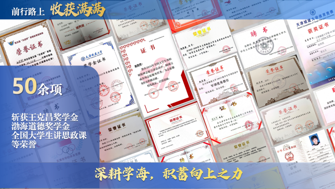 近年来,我校持续涌现出一批像赵奕然这样全面发展的优秀学子。他们在学术科研、社会实践、参军报国、志愿服务等多个领域发光发热,以青春之力诠释责任担当,充分展现了我校学子勤学笃行、奋发向上的精神风采。截至目前,我校共有2名学生获天津市高校“大学生年度人物暨王克昌奖学金”特等奖,4名学生获天津市高校“大学生年度人物提名奖暨王克昌奖学金单项奖突出贡献奖”,他们为全校同学树立了可感可学的青春标杆。