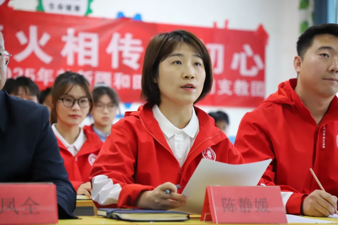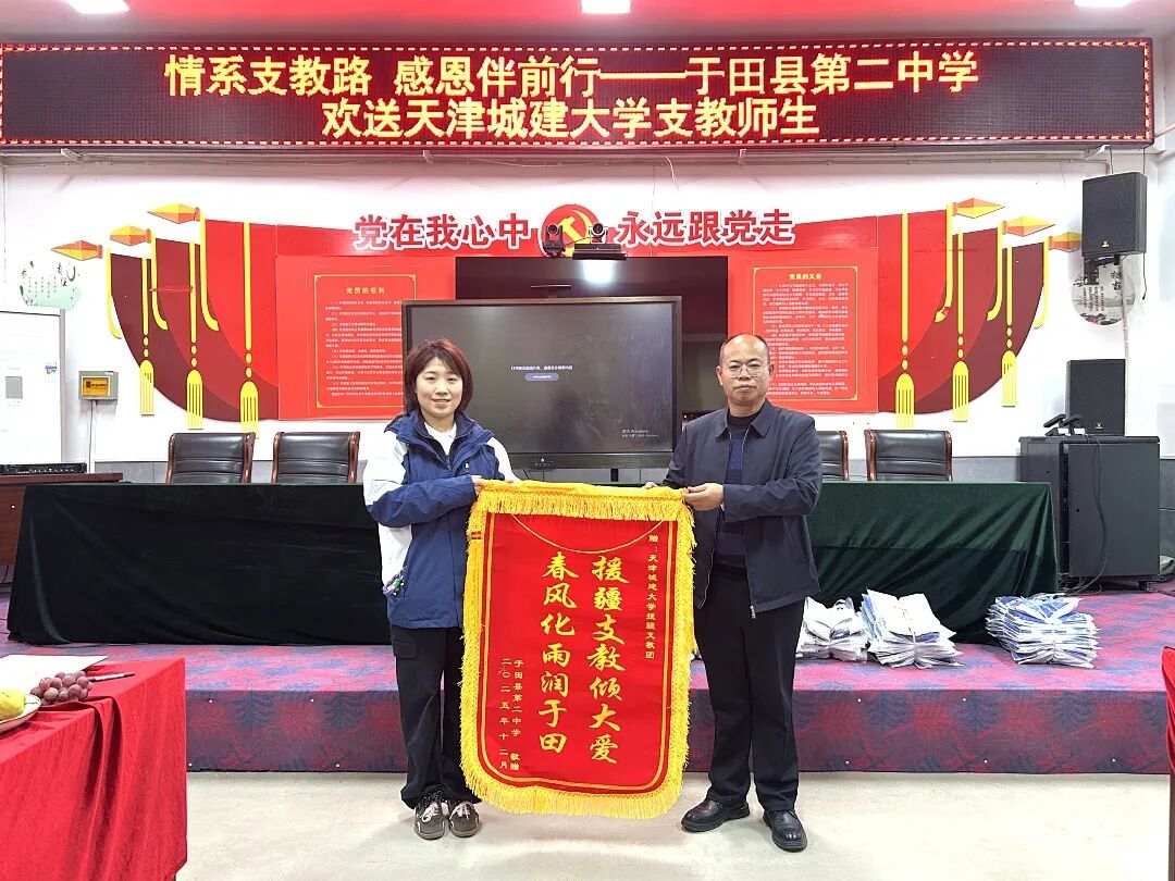 9月15日,学校隆重举行2025年赴新疆和田实习支教团出征仪式。校党委副书记王罡授旗,支教团领队陈静媛郑重接过团旗。全体支教团师生面对团旗庄严宣誓:“高举旗帜,甘于奉献;牢记使命,勇挑重担;重德重能 善学善建;虚心学习,躬身实践;献身边疆,圆梦和田;永葆家国情怀,谱写支教新篇。”铿锵誓言,掷地有声,展现了天城大青年投身边疆、教育报国的坚定决心。出征前,学校组织了系统的行前培训,为支教之旅奠定了坚实的思想、业务和安全基础。