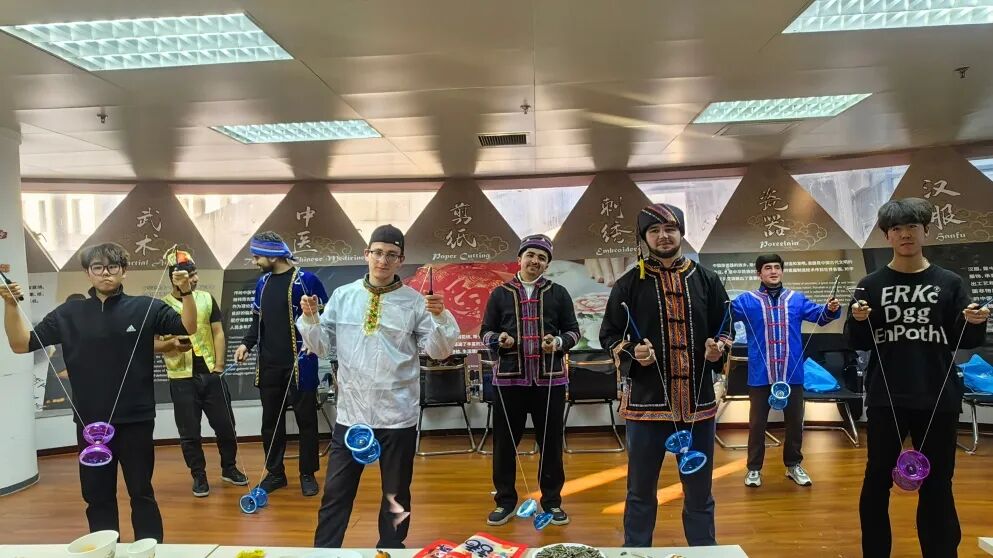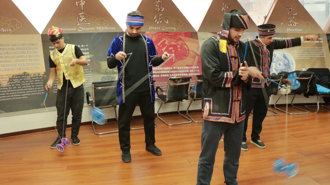 文化讲解余韵未消,一场别开生面的表演又将气氛推向高潮。由中外学生代表共同带来的抖空竹表演精彩纷呈。灵动的空竹在中外学生们的手中上下翻飞,绘出一条条优美的弧线。这场由中外友人对中华传统文化的共同演绎,不仅展现了中华传统技艺的独特韵味,更是中外学子友谊与协作的生动体现。
