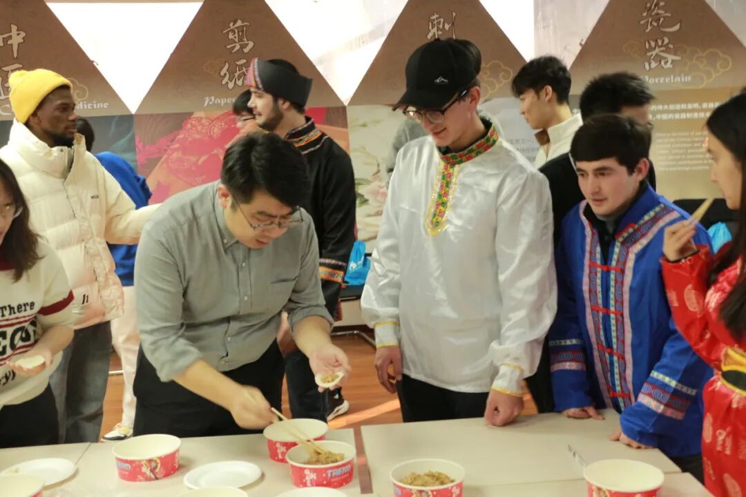 在备受期待的“全员包饺子”环节,在老师和中国同学的指导下,留学生们饶有兴致地学习填馅、捏合,学院教师和中国学生们也热情地分享着包饺子的技巧和家乡的饺子样式。随后,师生们围坐在一起,品尝着这份象征团圆与祝福的传统美食——热气腾腾的饺子,欢声笑语不绝于耳。现场其乐融融,气氛热烈,小小的饺子成了连接中外师生情感的纽带,让大家在亲手实践中深切体验了中国的“年味”。