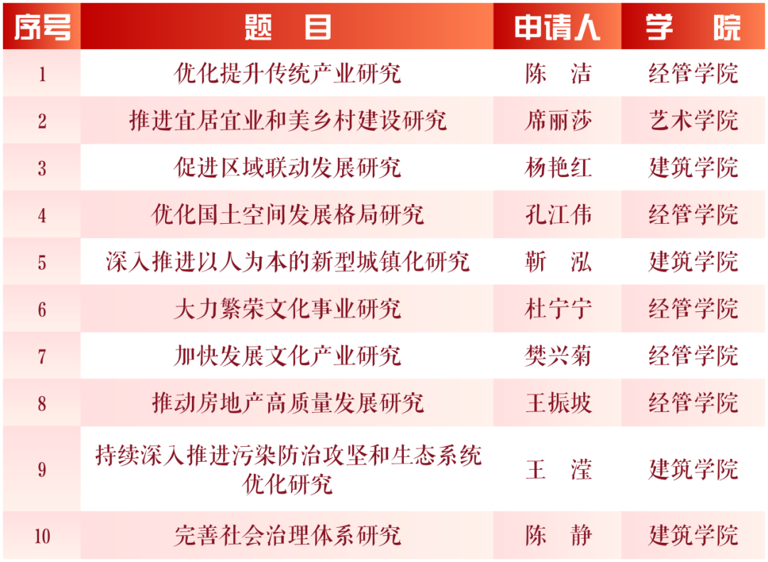 我校获批的10个项目覆盖多个核心学科领域,研究内容紧扣国家重大战略需求和天津改革发展实际,精准对接新质生产力发展、美丽中国建设、京津冀协同发展等关键方向,课题将重点围绕传统产业优化升级、宜居宜业和美乡村建设、区域联动发展深化、国土空间格局优化、以人为本新型城镇化推进、文化事业繁荣发展等重要选题,开展系统性理论研究与实践性路径探索,着力形成具有理论深度、实践价值与决策参考意义的高水平成果,为天津构建现代化产业体系、推进高质量发展“十项行动”注入学术动能。