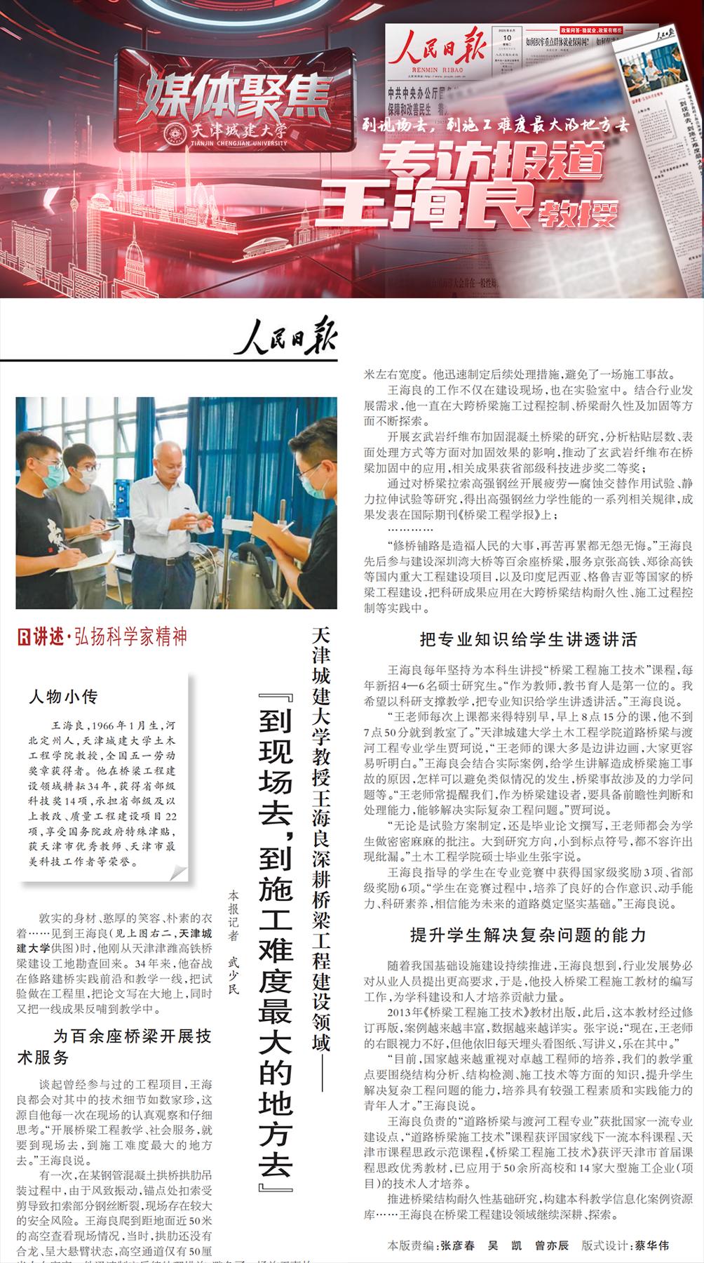 《人民日报》专题报道了我校土木工程学院王海良教授的先进事迹。三十年来,王海良教授始终深耕桥梁工程一线,秉持“把试验做在工程里,把论文写在大地上”的理念,坚持深入施工现场攻克技术难题,以实际行动践行科学家精神,生动诠释了扎根实践、服务国家、教书育人的使命与担当。