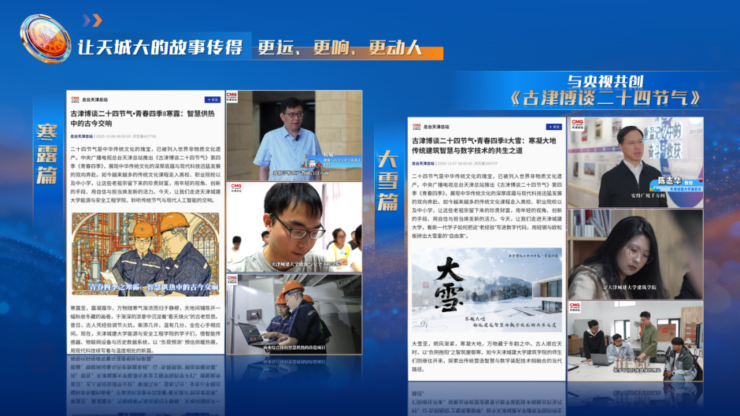 学校积极对接央视新闻等权威媒体平台,扩大学校声量,与央视新闻合作《古津博谈二十四节气》两期节目,凭借深厚的专业底蕴与生动的创意表达,实现了单期播放量超72万的亮眼成绩,不仅生动展现了学校的学科特色与人文积淀,更在跨界传播中实现了专业知识的“破圈”覆盖,成为高校文化创新传播的一次有益实践。