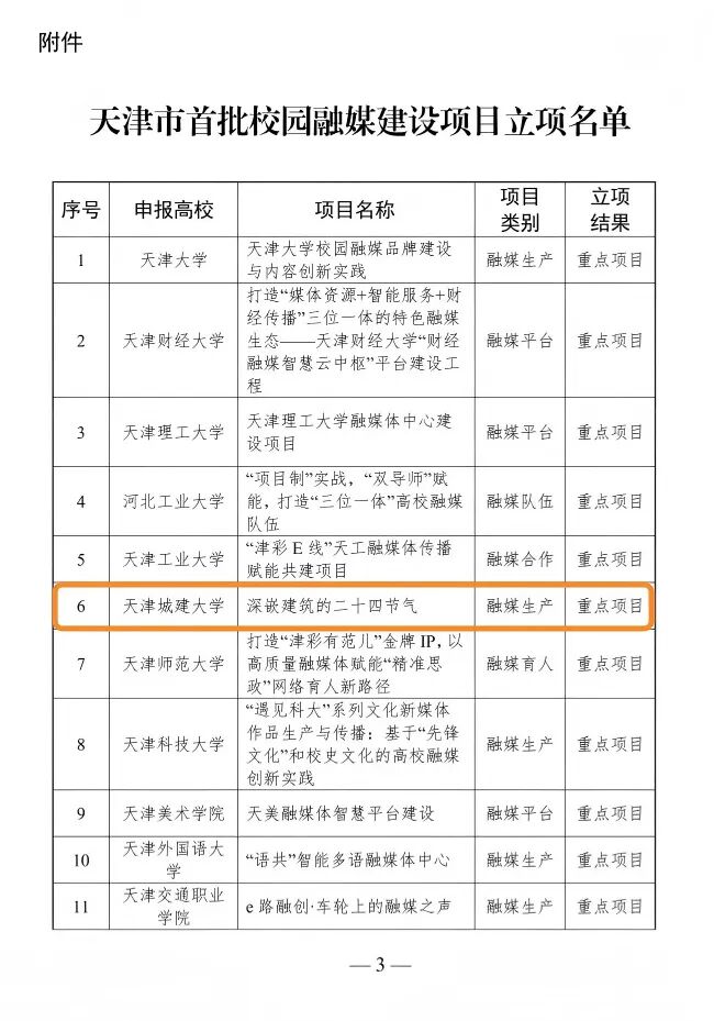近日,中共天津市委教育工作委员会、天津市教育委员会联合公布天津市首批校园融媒建设项目立项名单,我校申报的《深嵌建筑的二十四节气》项目依托学校城建类学科专业特色,创新的建设思路和系统可行的实践方案,成功获批重点项目,成为全市11个重点立项项目之一,标志着学校在教育融媒体建设方面取得新的突破。