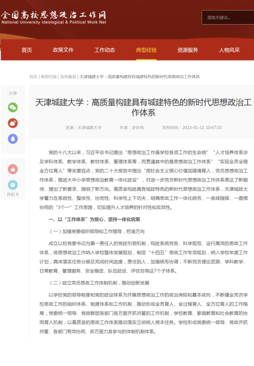 全国高校思政网、天津教育报刊发校党委书记史庆伟文章《天津城建大学:高质量构建具有城建特色的新时代思想政治工作体系》