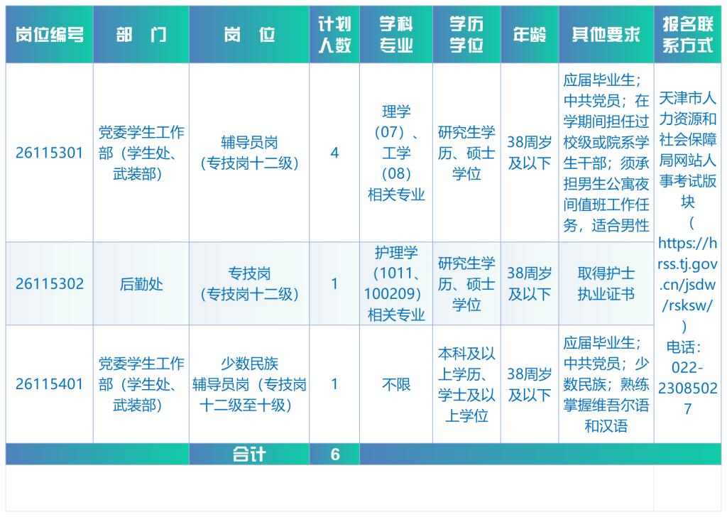 根据《中共中央组织部人力资源和社会保障部关于进一步做好事业单位公开招聘工作的通知》(人社部发〔2024〕57号)《天津市事业单位公开招聘人员实施办法》(津人社局发〔2011〕10号)等有关文件要求,结合我校人员需求实际情况,拟公开招聘硕士和少数民族辅导员,现将有关事项公告如下: