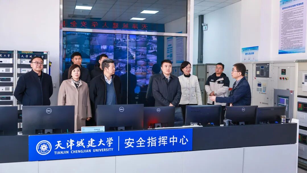 校领导一行在安防监控中心,通过监控大屏实时调阅了校门、主干道、教学楼、实验室、学生公寓等重点区域的安防画面,听取了安工部关于开学季校园安全整体安排、校园安防设施运维、重点区域24小时巡查值守以及应急处置准备、演练的相关情况。