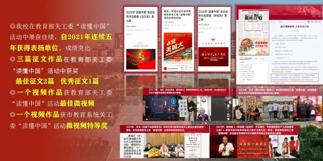 依托“读懂中国”活动持续深耕思政品牌。近5年来,校院两级关工委共同挖掘“五老”精神富矿,广泛发动青年学生走访交流“五老”典型,并创作大量征文、微视频作品,协同育人成效显著。学校关工委自2021年连续五年获得教育部关工委“读懂中国”活动表扬单位,成绩突出。