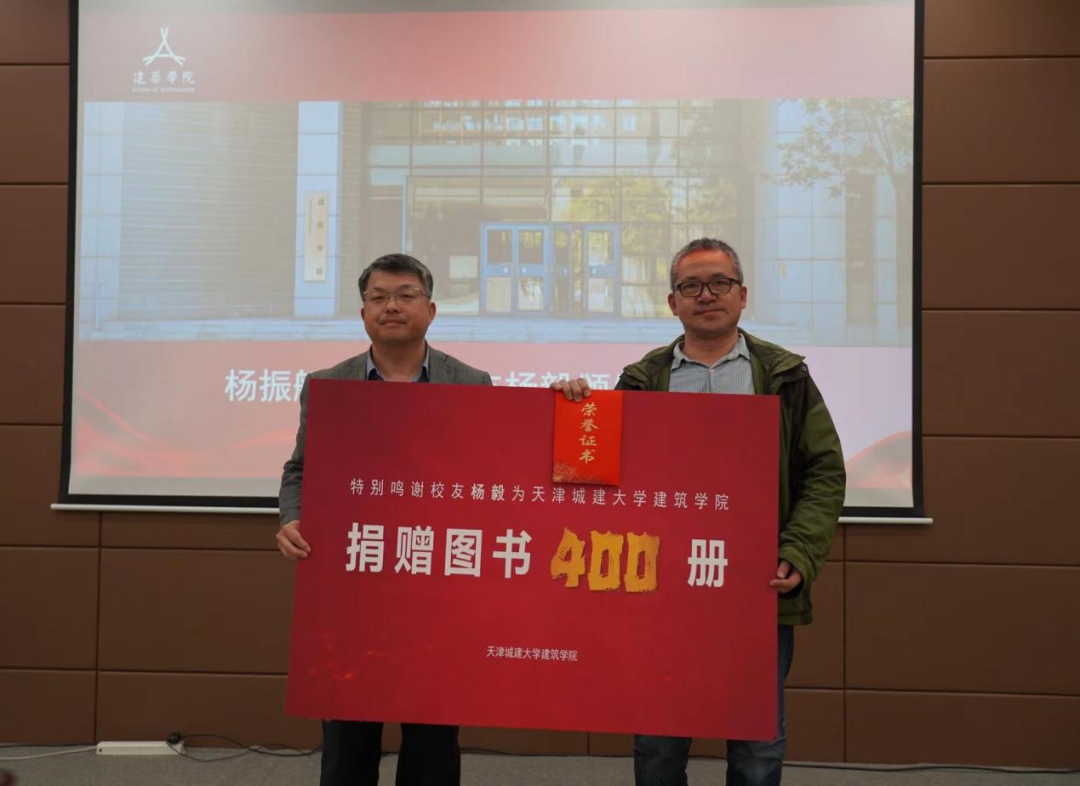 我校86级建筑学校友杨毅为学院捐赠专业类书籍400本。书籍内容丰富、种类繁多,不仅充实了学院图书馆的馆藏资源,同时也是对后辈学子们的精神激励,激励他们励志笃行,奋发有为。建筑学院党委书记杨振舰为校友杨毅(由学院党委委员、86级建筑学校友周庆代领)颁发捐赠证书。